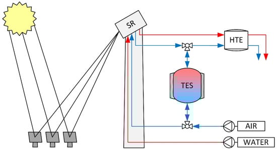 Simplified schematic CSP process layout without showing heat recuperation of the high-temperature electrolysis exit streams. Red and blue lines show the water/steam and air path, respectively.