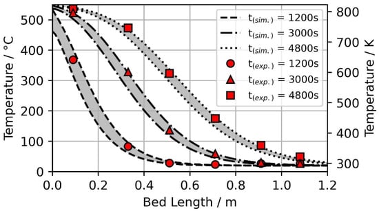 This correlation has been derived using experimental data of a similar setup to the one of Meier et al.; therefore, a good agreement shall be found to verify newly developed numeric procedures. In Figure 3, an agreement between the numerically calculated temperature profile (black lines) and the experimentally measured temperature (red markers) is achieved and the model implementation can be considered verified. However, the model of Coutier and Faber neglects the fluid phase property change due to a change in temperature. Therefore, the model by Wakao et al. is used for the parametric study as it also covers a large range of Reynolds numbers and is in the average of other correlations [22].