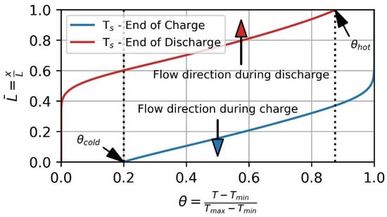 In the numerical calculation, the TES outlet temperature is compared to θhot and θcold during discharging and charging operations, respectively. Furthermore, the current time step of the ongoing simulation is compared to the maximum charging or discharging time. If either temperature threshold or maximum time is reached, TES operation is switched to either discharging or charging the storage. Figure 4 displays the temperature profiles of the solid phase at the end of charge and discharge, respectively, for an exemplary case. In this figure, the flow direction for each case is visualized by the red and blue arrows and the temperature thresholds θcold and θhot for the gaseous phase are plotted as dotted lines. The area between both lines is the usable storage capacity.