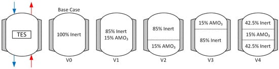 V1, V2, V3, and V4 have 15% of their volume replaced by selected perovskite. In V1, the material is evenly distributed in the whole storage volume. In V2, V3, and V4, the material is located at the bottom, top and middle, respectively. Thus, the reactive material is charged and discharged under different operation conditions. In V2, the reactive material is placed at the cold end and is not heated to the maximum temperature. By placing it on top of the storage (V3), the material will never cool down to the minimum temperature. In cases V2 and V3, the heat stored as sensible heat in the reactive material is expected to be small compared to V1 and V4. Furthermore, it is expected that the stored sensible heat is the highest in V4. In the center of the TES, the material will be exposed to the maximum temperature difference between the end of charge and discharge and, therefore, the thermochemical stored heat is expected to be the highest as well.