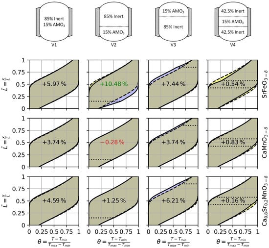 Thermoclines behavior after 15 cycles of the four investigated storage concepts with SrFeO3−δ, CaMnO3−δ and Ca0.8Sr0.2MnO3−δ. The dashed line shows the thermocline at end of charge and discharge of the base case (V0) and the solid line shows the thermocline of V1, V2, V3, and V4 for the selected perovskite. The purple and yellow area indicate an increase and decrease of the local material utilization, respectively.The dotted lines indicate the placement of the reactive material in V2, V3 and V4. The values in the center of each figure show the change in storage capacity compared to the base case (V0).