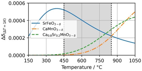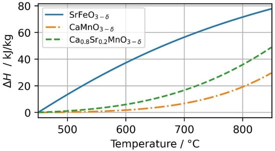 Perovskite with the structure AMO3−δ is able to be tuned by varying the A and M site ions. We presented two different perovskites (SFO and CMO) and one with an additional ion on the A site lattice of the material (CSMO). Further, perovskites can be tuned with two A and two M site ions resulting in [76]. Vieten et al. [76] experimentally evaluated 24 different perovskite compositions for validating a perovskite design method. Among these, CaxSr1−xMnyFe1−yO3−δ can be a promising perovskite mixture for the investigated setup, e.g., depending on the x and y amount of A and M site doping, respectively, they could offer a favorable redox behavior close to the upper boundary temperature of 850 °C. Thus, the change in stoichiometry could take place in a temperature range between the investigated SFO and CMO, e.g., a hypothetical redox behavior of a CaxSr1−xMnyFe1−yO3−δ configuration is depicted in Figure 11 together with SFO. For this, the parameters Δh0, Δsth and a of Equations (11)–(13) were changed in a range between these of SFO and CMO. Both materials have their peaks close to the boundary temperatures of the investigated case.