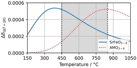 Change in non-stoichiometry Δδ based on temperature change of 1K at pO2 = 0.18 bar. The change of SrFeO3−δ and a hypothetical AMO3−δ perovskite is visualized over a temperature range from 150 to 1050 °C.