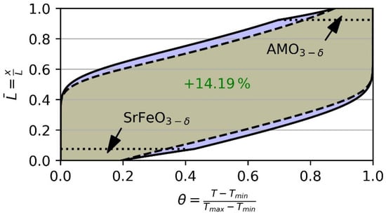 using the molar mass of air MAir and the molar fraction of O2 xO2. Based on the estimated operation temperatures of 450–850 °C and using Equation (13), a maximum change of Δδ = 0.14625, 0.02642 and 0.050435 is expected for SFO, CMO and CSMO, respectively. Considering the different cases selected for the parametric study, a 15% replacement of the volume by reactive material will result in a maximum oxygen amount of about 793,000 mol for a full reaction extension between 450 and 850 °C using SFO. Thus, it takes approximately 1641 s to provide the needed oxygen molecules for the full reaction using the estimated molar flow from Equation (17). However, due to the thermocline behavior of the TES and the non-stoichiometric reaction behavior, the full reaction extension does not take place at the same time during the cycling operation of the TES. For the used time step dt = 10 s, the maximum amount of oxygen cycled in the reaction is nmax = 1208.13 mol for V1 using SFO. Thus, it is less than the supplied oxygen rate of 483 mol/s (=4630 mol in 10 s). Low oxygen partial pressure affects the reaction rate and the non-stoichiometric reaction extension of the perovskites [51,52,53,75]. Thus, oxidation can be slowed. Therefore, this assumption is not applicable to lower mass flow rates. However, the highest change in reaction occurs during the initial TES cycle, when the storage is charged for the first time. For the initial cycle, the temperature difference between the heat transfer media and the storage material is the highest and the reaction extension is expected to be the highest as well. However, the initial cycle is not of interest in this study. In the following cycles, the maximum amount of oxygen cycled is 445.89 mol per time step. Thus, about 10 times more oxygen is supplied during the same time period. Therefore, the change of oxygen concentration in the gaseous phase can be neglected in the investigated scenario.