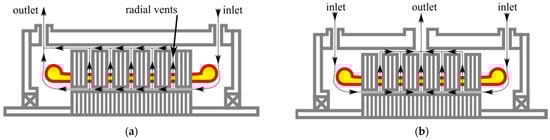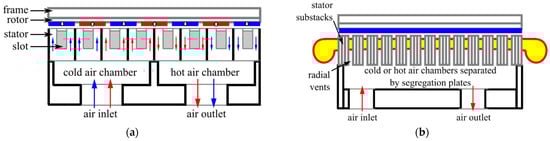 - Fan, X.G.; Qu, R.H.; Li, J.; Li, D.W.; Zhang, B.; Wang, C. Ventilation and thermal improvement of radial forced air-cooled FSCW permanent magnet synchronous wind generators. IEEE Trans. Ind. Appl. 2017, 53, 3447–3456. [Google Scholar] [CrossRef]