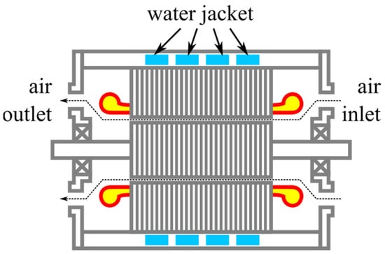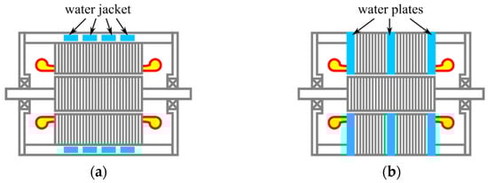 - Fasquelle, A.; Laloy, D. Water cold plates cooling in a permanent magnet synchronous motor. IEEE Trans. Ind. Appl. 2017, 53, 4406–4413. [Google Scholar] [CrossRef]
