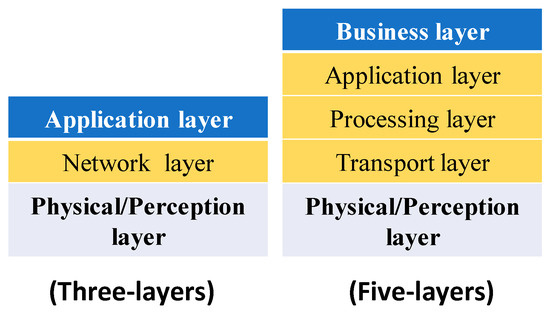 IoT architecture incorporates sensor data, operation to or from devices, sending or receiving info, sensed data, storage, processing, analysis, services, applications and end exploitation using fog, cloud and edge computing [23]. IoT frameworks implement various technologies. However, it is widely acknowledged that there is no single solution for the architecture of an IoT system [24]. In the literature, the common IoT architecture contains three or five layers [25,26,27,28]. Figure 1 shows IoT architecture with three and five layers [23,24].