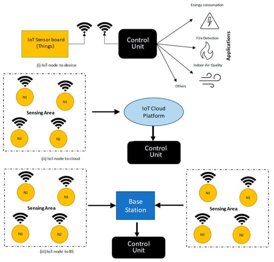 In IoT applications, various realistic communication models are employed, each with its unique set of properties. Figure 3 illustrates three public communication models [33]: (i) IoT node to device, (ii) IoT node to cloud, and (iii) IoT node to base station. These models emphasize the versatility with which IoT devices can connect and deliver value to users. Furthermore, the selection of a communication model in IoT for certain applications depends on the ability of the devices to implement full protocol stacks, such as Internet protocols IPv4, IPv6, Hypertext Transfer Protocol (HTTP), etc., as follows: