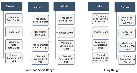 - LoRa is a wireless modulation developed by Semtech [38] for long-distance low-power and data rate uses. It was developed to lessen the impact of interference. LoRa employs a Frequency Hopping Spread Spectrum (FHSS) which provides access to all channels. It has been demonstrated that communication ranges of 15 km or more are possible in urban settings [36,39].