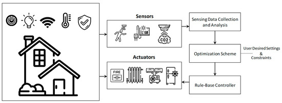 Imran et al. [58] presented a study to demonstrate IoT task management to reduce energy consumption in smart buildings. Figure 5 demonstrates a diagram of data flow with an optimization approach that was applied to control energy consumption from only IoT technologies [58]. The method pointed out that regardless of spatial requirements and building design. The approach operates in four phases. First, it collects data from the indoor environment via sensors such as carbon dioxide (CO2), air temperature (AT) and relative humidity (RH). Second, it employs a prediction module to prepossess and control the noisy sensing data. Third, it utilizes a mathematical optimization module to compute the appliance’s usage in a specific situation when it increases and decreases. Finally, the outputs from modules optimize the usage and reduce the cost of energy consumption.