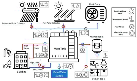 At a different level, Li et al. [60] used IoT with a solar water heating (SWH) system to improve energy efficiency in a building. The study was conducted in a hospital in Singapore to demonstrate IoT efficiency by monitoring solar levels, operational schedule, water flow and electricity consumption. The study was performed by a thorough energy audit. The IoT sensors are demonstrated in Figure 6. Several sensors were used for this study, including a solar irradiance sensor, flow meter, temperature sensor, status sensor and electricity meter. The study found that the SWH with simultaneous control has the capability to save electricity by up to 32.9%.