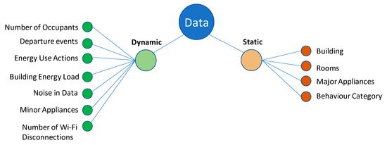Beyond building components and the physical layer of IoT technologies, building occupants, or in other words, users, play an important role to determine energy consumption in any building. Users represent the main entity that utilizes energy to attain comfort, safety and satisfaction. Generally, IoT offers a wide range of options that benefit occupancy detection and activity recognition [61]. Many studies indicated the importance of occupant energy behavior in reducing electricity consumption [62,63]. Zhang et al. [64] stated that 30% of energy use in commercial buildings could be saved by adopting energy-aware behaviors among building users. Rafsanjani et al. [65] studied user energy behavior using IoT. The study demonstrated useful results by employing data in the form of static and dynamic factors in a building as shown in Figure 7.
