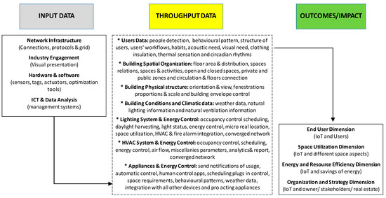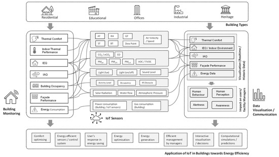 Massive challenges caused by rapid digitalization have greatly increased the demand for energy [1]. Energy consumption around the world is estimated to increase by 56% in 2040 [2]. Internationally, there are efforts to reduce energy consumption in buildings and cities such as the EU’s 2050 roadmap which aims to lessen energy and gas emissions by approximately 40% [3]. The new era of digitalization opens new possibilities to improve human health and productivity and enhance energy efficiency in the built environment. The Internet of Things (IoT) represents one of these opportunities to decrease energy demands and meet sustainable development goals. In general, the concept of IoT was introduced as interconnected objects using radio-frequency identification (RFID) for the first time in 1999 by British technology pioneer Kevin Ashton. The two words “internet” and “things” as combined, convey an innovation with regard to information and communication technology (ICT). The notion of interconnected objects enables everyday physical objects to integrate electronics seamlessly into any global physical infrastructure [4]. Even though the term is established within these two words, the definition of IoT still depends on the research perspective [5,6].