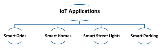 IoT provides tremendous potential in offering smooth interaction in intelligent environments among devices/appliances with or without human interference [7]. For instance, the term “smart thing” can be presented in a human with a monitoring sensor, a car equipped with a safety sensor or a bird with a GPS sensor, etc. [8]. Currently, there are more than 31 billion devices connected over the internet as IoT that are distributed in different sectors from individual buildings to city blocks or even entire cities and are estimated to rise to 170 billion by 2050 [9]. This surge relates to the capability of devices connected via IoT to perform a key role in sensing, measuring and processing data that open immense opportunities to be used for monitoring, controlling and boosting the efficiency of energy use in any system [10]. Generally, various studies in IoT applications discussed and investigated energy efficiency at different levels and scales [11,12].