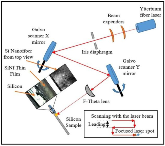 Four samples were created by varying the power and frequency (600, 800, 1000, and 1200 kHz) of the laser. The sets were named ‘S’ and ‘A’ samples. The S samples (constant pulse energy) had varying frequency and varying power (10, 13.3, 16.7, and 20 W) with a constant amount of energy (110 μJ), while the A samples (constant power) had varying frequency, and the power was constant at 15 W. The details are provided in Table 1 and Table 2. The silicon wafer was mounted, and MarkingMate 2.7 software was used for the setting the pattern and various parameters for the samples to be ablated. The nanostructure formation was established at ambient temperature and pressure. The schematic layout of the setup is shown in Figure 1.