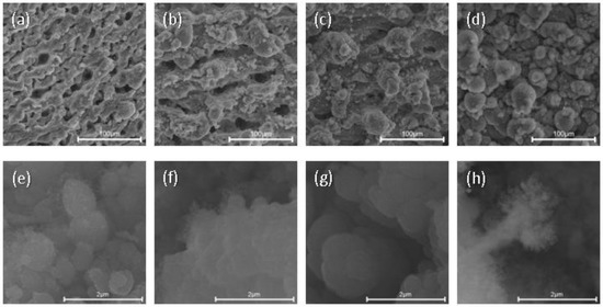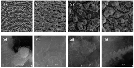 SEM images of A samples. (a–d) A1–A4 at 100 μm; (e–h) A1–A4 at 2 μm.