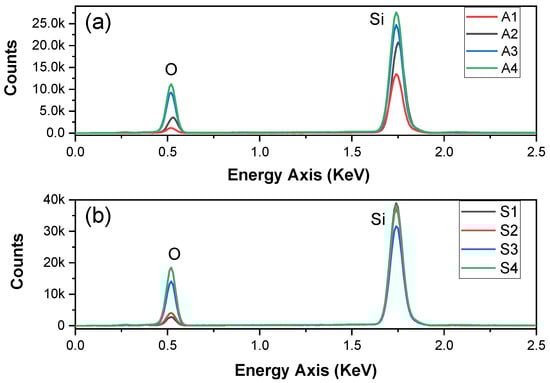 EDX of the samples: (a) A set of samples, where A4 had the highest O content and A1 had the lowest; (b) S set of samples, where S4 had the highest O content and S1 had the lowest.