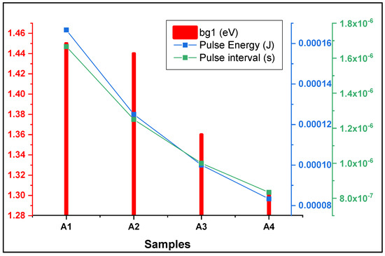 Figure 6 shows the bandgaps of the A samples, where we suspected the effect of quantum confinement on the basis of the SEM images and the results obtained for the bandgap. According to the quantum confinement effect, the bandgap increases as the particle size decreases. The size of the particles under the quantum confinement effect also defines the bandgap size, whereby a smaller size results in a larger bandgap [26,27]. However, quantum confinement cannot be effectively defined solely on the basis of the optical bandgap [28]. For the A samples, although the bandgap was enhanced, there was a decrease in the bandgap when going in ascending order. The decrease in bandgap was related to the decrease in the pulse energy of the samples from A1 to A4, as can be noted in Figure 7. As the pulse energy was reduced, the nanoparticle formation was also decreased. The decline in the energy of each pulse led to lower ablation; accordingly, the bandgap enhancement was lower for the A4 sample. This change was coherent with the SEM images for the samples.
