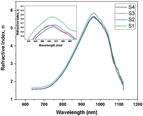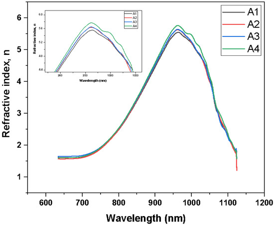 The refractive index of the samples plays an important role in determining the optical conductivity of the samples, along with the bandgap of the material. The relationship between bandgap and refractive index plays a major role in determining all other optical and electrical properties of the materials. From Figure 10 and Figure 11, a trend in the variation of the refractive index of the samples can be determined. The refractive index showed a peak in the IR range, which is the typical range for silicon. We can observe that there was an increase in the refractive index with the increase in wavelength; then, at lower energy, we can observe a decrease in the refractive index. The decrease in the refractive index at higher wavelengths was due to the lower absorption of light by the samples in a higher bandgap. The increase in refractive index of a material depends on the absorption of light by the material. This characteristic was common for all the samples. However, the refractive index curves showed the inverse trend to that of the bandgap, whereby the refractive index decreased with the increase in bandgap.