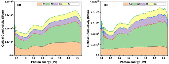 The optical conductivity is dependent on the relationship between the bandgap of the material and the refractive index. As discussed above, as the bandgap of the samples increased, the optical conductivity decreased, as also shown in Figure 12. The conductivity increased for the A set of samples from A1 to A4, whereas, for the S set of samples, the optical conductivity decreased from S1 to S4. The optical conductivity of the material is greatly dependent on the bandgap of the material. Here, as the bandgap of samples A1 to A4 decreased, there was an increase in the optical conductivity. The decrease in the bandgap allows for more electrons to reach the conduction band with less photon energy. The excitation required is, hence, lesser. In the S set of samples, as the bandgap increased, there was a decrease in the optical conductivity. Moreover, the optical conductivity is dependent on the optical absorption of the nanostructures; with a larger nanostructure size, the absorption is higher [30]. Here, the size decreased, in turn lowering the absorption, as well as the optical conductivity.