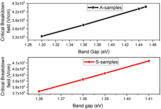 On the basis of the bandgap of the samples, the critical electric field was calculated. The critical breakdown field is proportional to the bandgap with a power of 2 for indirect bandgap materials. The critical breakdown field of silicon is generally lower than that of other semiconducting materials. Silicon has a breakdown electric field of 0.2 × 106 MV/cm for 1000 V operation [34], which is closer to the value for GaAs (0.3 × 106 MV/cm) [35]. The critical breakdown field was calculated using the following equation [36]: