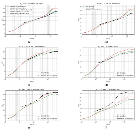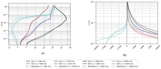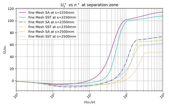 Here, represents the wall-parallel component of the fluid flow, and n is the wall-normal coordinate. It is important to mention that the fulfillment of both criteria according to Equation (27) ensures an acceptable identification of the viscous–inviscid interface or boundary layer edge, particularly in the recirculation flow zone. The second derivative of in the wall-normal direction describes the local curvature of the velocity profile, which must be zero in the inviscid region. Figure 2 provides a pictorial representation of the intuition behind the approach employed in the present work. Note, in Figure 2a, that the viscous RANS solution starting from the wall highly disagrees with the potential solution. However, as the distance from the wall grows, viscous RANS tends asymptotically to the potential solution until further, in the free-stream, the viscous RANS solution is consistently very similar to the potential solution. Moreover, with the cyan color curve of station s = 2500 mm (at the separation bubble), note how the velocities first matched in a wall level without actually both solutions having the asymptotical behavior, confirming that the second criterion in Equation (27) is necessary. With the possibility of multiple wall levels with the solution’s paths crossed, the issue is solved by looking at the slopes. Figure 2b shows the wall-normal derivative of the streamwise velocities; note the asymptotical and overlapping behavior of the viscous solution towards the zero value and potential solution again. It can be intuitive that after some n distance, the absolute value of the wall-normal second derivative of viscous solution is going to be equal to the corresponding derivative of the potential solution; or at least, a smaller second derivative for the viscous solution compared to the potential solution due to the tendency to zero showed in both solutions.