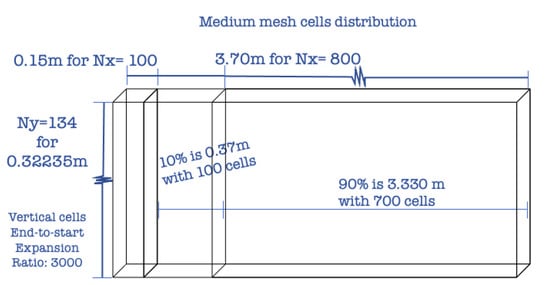 In the flat plate or turbulence inflow generator scenario, the total domain’s length was set to 3.85 m with an initial 0.15 m length as a slip-condition. Three meshes were designed, namely coarse, medium, and fine mesh, as described in Table 5. Furthermore, vertically end-to-start cell expansion ratios () were 4140, 3000, and 1900, respectively. The vertical cell expansion ratio, , is defined as the dimensionless relationship between the end cell near the top surface to the start cell in the near-wall region, i.e., . In the inlet plane, freestream conditions were set, i.e., 20 m/s for the horizontal velocity and 323.15 K for the static temperature (passive scalar).
