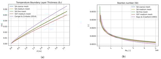 The flat plate simulations have shown excellent agreement with empirical correlations. The obtained information (i.e., velocity and thermal profiles) was used to inject a more realistic (and developed) boundary layer flow into the curved-hill domain inlet. Because Spalart–Allmaras cases were executed first, it was found that the results of coarse to fine mesh were sufficiently resolution independent; therefore, SST was only performed with coarse and medium resolutions. Figure 8a displays the boundary layer thickness and comparison with the -power law given in [34]. Figure 8b presents the skin friction coefficient and the theoretical formulation proposed by Kays and Crawford [35]. Regarding the passive scalar solution, the temperature boundary layer thickness is shown in Figure 9a; as it can be seen, the results are just differentiated by the turbulent model used. Furthermore, to validate the temperature fields, the Stanton number was used in Figure 9b by comparison with the theoretical formulation given by Kays and Crawford [35].
