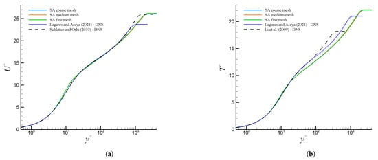 Figure 10 shows the extracted streamwise velocity and thermal profiles from the flat plate simulations for the three meshes and based on the SA turbulence model at a location ( 2.458 m) where the local momentum-thickness Reynolds number, , is approximately 5659.7. Furthermore, in Figure 10a, the mean streamwise velocity is depicted in wall units (i.e., and ), where a consistent trend can be observed in all meshes. Here, where is the wall shear stress and is the fluid density. It is worth highlighting that we will use interchangeably and to denote wall-normal coordinates in this manuscript. In addition, a very good agreement is seen with DNS data from [9,10] at = 2354.7 and 4060, respectively. Some discrepancies can be detected around 10 and in the wake region (i.e., beyond the log region). The latter could be attributed to some Reynolds number dependency. Figure 10b exhibits the mean temperature profile (or passive scalar) normalized in wall units, as well. Here, , where T being the dimensional static temperature, is the wall temperature, and is the freestream temperature. The friction temperature is defined as , where is the wall heat flux and is the fluid specific heat. Moreover, an excellent collapse of the RANS results via the SA turbulence model is visualized in the linear viscous layer and buffer region (i.e., for ) as well as with DNS data from [4,9] at = 2354.7 and 800, respectively. In the log and wake region, significant differences can be observed between the RANS and DNS approaches. One can infer that the turbulent Prandtl number model employed in RANS simulations has performed quite well in the near wall region, whereas it has been able to reproduce moderately well the thermal field in the outer part of the turbulent boundary layer. Despite the fact that all meshes have generated similar outcomes, the solutions of SA medium mesh were selected for inflow in the curved hill cases (i.e., streamwise and wall-normal components of the mean velocity and temperature). Readers are referred to Appendix A for a comprehensive grid sensitivity study.