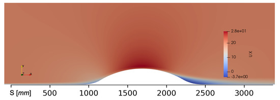 Before beginning with the curved hill cases, a scenario of the turbulent flow over a flat plate was considered using SST and SA models. For all cases presented in this work, the classical no-slip condition was prescribed at the wall surfaces for the velocity fields; meanwhile, an isothermal condition of 293.15 K was prescribed for the thermal field. The top-surface boundary condition was set via a zero-gradient of all flow parameters (shear-less wall) and a zero-pressure gauge value at the outlet boundary. For the SA’s conditions, and were specified as zero at the walls, while = 1.5 × 10 m/s and = 1.1 × 10 m/s for both constant inlet and domain’s initial state. For the SST’s conditions, the turbulent intensity was assumed as 1%, giving K = 0.06 m/s and = 4000 1/s to be applied as Dirichlet conditions at the inlet plane and walls, while = 1.5 × 10 m/s was employed to initialize numerical predictions.