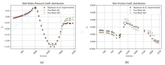 In summary, both turbulence models were not selected arbitrarily. We have chosen the best representatives from one and two-equation turbulence models. The Spalart–Allmaras (SA) model (or one-equation model) has been described to be incomplete by Wilcox [28] since any turbulence model would require at least two scales: a velocity scale and a length scale. However, the SA model has shown simplicity, robustness, and versatility in attached turbulent boundary layer simulations [3,29,30,31] including high-speed turbulent boundary layers [32,33]. Previously mentioned studies have emphasized a degradation in the SA model’s accuracy for more complex geometries with flow separation. In particular, the SA model under-predicted the size of the separation bubble. On the other hand, the hybrid SST model by Menter involves blending two well-known two-equation turbulence models: the standard model in the near wall region and the model in the outer region and freestream of the boundary layer to overcome the strong freestream sensitivity of the turbulence model. It is worth highlighting that the SST eddy viscosity model involves a further improvement based on the idea of the Johnson–King model, which assumes that the transport of the main turbulent shear stresses is critical in the simulations of strong adverse-pressure gradient (APG) flows prone to boundary layer detachment.