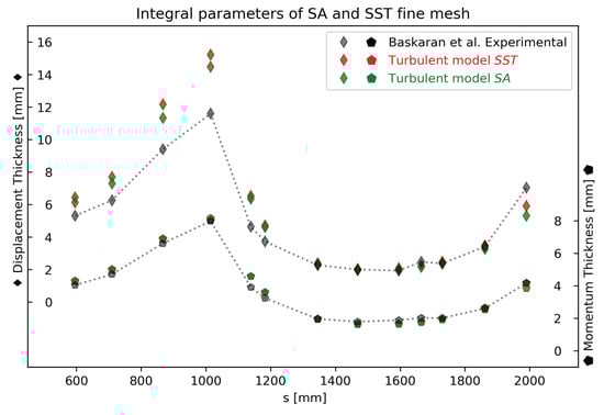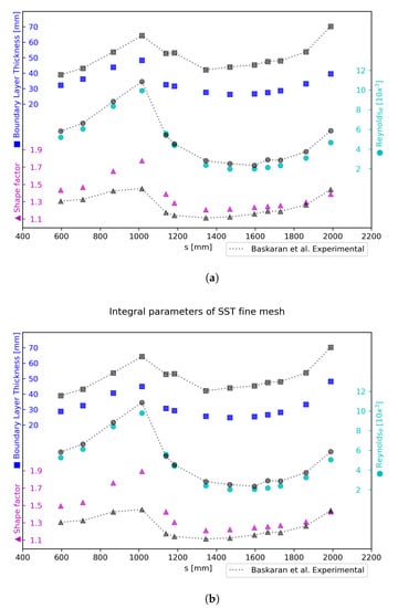 For the creation of Figure 17, our potential flow-based scheme used Equations (30) and (31) to calculate displacement and momentum thickness parameters. Meanwhile, for Figure 16, the parameter used a reference velocity, , where after following the results of [1], it was found to be s = 596 mm, i.e., the reference station.