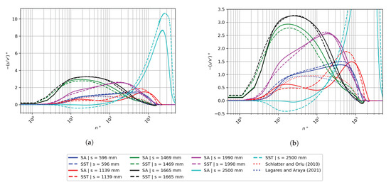 Figure 14a depicts the pressure coefficient along the computational domain. The pressure coefficient is defined as . Here, is the wall static pressure, is the freestream static or reference pressure, and is the freestream dynamic pressure. In general, a fair agreement is observed with experimental data by [1]. As the flow approaches the obstacle or hill, it decelerates due to the presence of an increasing pressure or APG. The maximum (≈0.375) is located at the hill feet. Interestingly, good performance of both turbulence models in reproducing the wall pressure coefficient was observed in the vicinity of the hilltop, where the streamwise pressure gradient abruptly switches from FPG to APG, passing through a very short ZPG-zone. It is expected that boundary layer flow experiences a severe distortion in that zone with combined pressure gradients. Major discrepancies occur by the end of the strong APG zone (second half of the hill) where back or recirculating flow can be found. This is consistent with the deficient performance of RANS-eddy viscosity models in capturing boundary layer detachment. While both turbulence models have predicted constant wall static pressures in the separation bubble (ZPG zone), which is physically sound; however, smaller pressure gauges were obtained by SA and SST, e.g., −0.0625 and −0.125, respectively, as compared to the measured valued of −0.25. In Figure 14b, the skin friction coefficient, , is depicted. The skin friction coefficient is defined as follows, , where is the wall shear stress. One can observe an opposite trend of as compared with the pressure coefficient . As the flow decelerates due to the presence of moderate APG nearby the hill feet (concave surface), it is seen a decreasing behavior of just downstream of the ZPG region where almost constant skin friction coefficient values are seen, as expected. However, it never reaches negative values, indicating that the mean flow does not separate. The wall shear stress then recovers as the flow starts to accelerate in the FPG region (convex surface). At roughly one-quarter of the curved hill (where the surface changes geometry from concave to convex) a meaningful increase of the wall shear stress and is observed since the flow strongly accelerates (FPG), and approximately a 100% increase can be seen with respect to the incoming under ZPG-flow conditions. Downhill, the pressure coefficient recovers (presence of APG), inducing a reduction in , to finally reach slightly negative values in the separation bubble ( 2100 mm). Obviously, the boundary layer flow should “pass-through” the laminar skin friction coefficient value before separating (i.e., < 0). This may indicate the presence of quasi-laminarized flow within 2000 mm < s < 2100 mm and in the near wall region [37] (extension of the viscous sub-layer). This supposition would be better addressed when discussing mean streamwise velocity and Reynolds shear stress profiles in the next pages. In summary, the SA and SST turbulence models have estimated similar and consistent values for regarding the experimental data from [1], perhaps the SA model has shown moderate supremacy, overall. The skin friction coefficient in the incoming ZPG zone is slightly under-predicted by both turbulence models (∼15% lower than in [1]). As previously mentioned, the most “challenging” situation for turbulence models has undoubtedly been the hilltop and vicinity since the flow goes through acceleration and deceleration in a very short distance. Major differences were computed as roughly 35% in that zone. According to [1], the location of the boundary layer detachment point was found to be situated at s = 2095 mm by extrapolation. The SA and SST models have predicted a separation point around 2100 mm, in very close agreement with experiments.