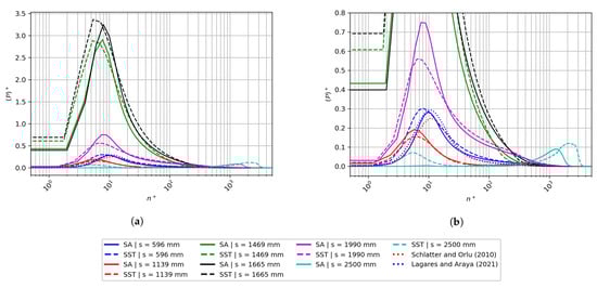 Here, k is the fluid thermal conductivity, is the fluid’s specific heat at constant pressure, and is the thermal gradient at the wall in the wall-normal direction. The Stanton number is a dimensionless number that relates the heat interchanged between the surface and the fluid to the thermal capacity of the fluid. From Figure 15a, one can observe nearly constant in the incoming flow (ZPG), which is typical in canonical or flat-plate boundary layers. A very good agreement was obtained with the empirical correlation by Kays and Crawford [35], who proposed a variation of as a function of the local momentum thickness Reynolds number, , for ZPG turbulent flows (adapted to = 0.71). The Stanton number (and heat transferred) peaks by 1125 mm, where () is located, demonstrating a high similarity between maximum viscous shear force and total heat transferred at the wall. This peak in the heat transfer (representing about an 80% increase regarding the incoming baseline ) is situated approximately by the end of the first concave bend. Downstream, the Stanton number decreases much faster than does, suggesting a non-similarity between these two boundary layer parameters. The strong changes of streamwise pressure gradients in this zone, which are sources of dissimilarity between the momentum and thermal boundary layer transport [38], are the reasons for that behavior. Beyond s = 1500 mm, a “plateau” is observed in values, and an abrupt reduction of the heat transfer is achieved by 2100 mm, caused by the presence of the flow recirculation zone. This separation bubble is characterized by a quasi-adiabatic process, since no heat transfer occurs between the surface and the fluid ( 0). Furthermore, the Stanton number can also be related to the skin friction coefficient via the Reynolds analogy (similarity between the viscous drag to the heat interchanged). We introduce the ratio in Figure 15b. An excellent agreement with the empirical correlation by [35] is seen in the ZPG zone. This ratio significantly departs from the unitary value by the hill feet (beginning of the concave bend, 987 mm). It is worth highlighting that remains very close to one in most of the curved hill for s > 1100 mm, getting large negative values in the vicinity of the separation bubble due to the very small (and negative) values of . In essence, both turbulence models have generated very similar Stanton numbers.