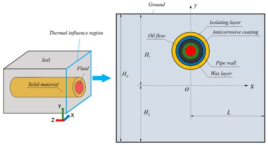 Figure 1 shows the geometry of buried oil pipeline system in this work. The entire system is a rectangular prism containing oil fluid, several circular materials, and the soil. The cross-section of the system is called the thermal affected zone []. According to the thermal test results from existing reports [], a sufficiently large heat affected zone was adopted in this system to capture thermal characteristics effectively. The length of and are both 10 m.