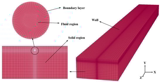 Figure 2 shows the mesh of the simulation model in this work. ICEM software was used to generate hexahedral structured mesh, and O-type mesh was generated for the fluid domain. To simulate the temperature field more accurately, considering the inhomogeneity of temperature gradient distribution, a dense grid near the pipe and a sparse grid far from the pipe were adopted. Ensure the accuracy of computing, using the local mesh refinement approach at the region of pipe wall, anticorrosive coating, and insulating layer. Moreover, to extract the calculation results, several cross-sections along the axial direction of the pipeline were established in the computational domain.
