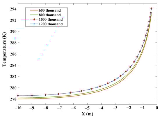 Mesh independence verification was carried out by computations of four groups of grids with different numbers, and the results shown in Figure 3. The numerical results of soil temperature along Path 8 were taken as the verification benchmark. When the mesh number reached 1000 thousand, the numerical results along the test line had no distinguished change. Therefore, considering both accuracy and efficiency of calculation, the grid with 1,003,968 meshes and 1,101,190 nodes was used for numerical calculation.