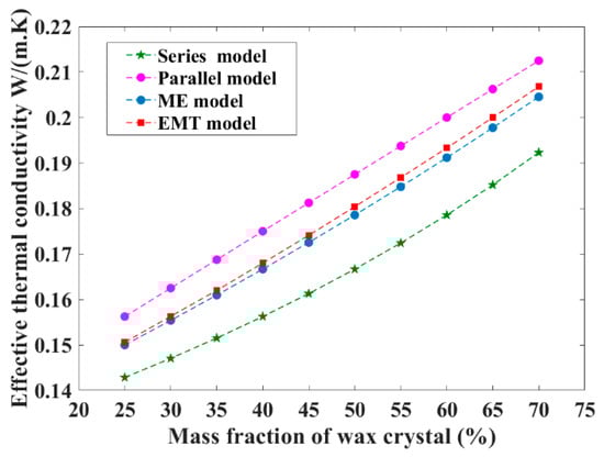 As can be seen from the Figure 4, the effective thermal conductivity increases with the mass fraction of wax crystal, and the calculation result of the Parallel method is the largest while the Series method is the smallest, and the calculation result of the ME and the EMT method is moderate. When the mass fraction of wax crystal is in the range of 30% to 65%, the effective thermal conductivity of the wax layer is in the range of 0.155–0.195 W/(m·K).