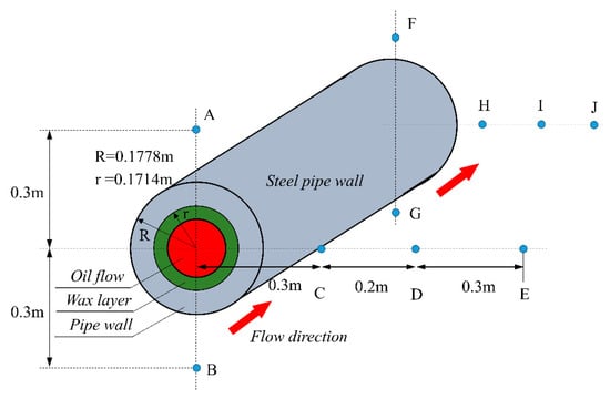 In the process of establishing and solving the model, some reasonable assumptions were adopted. We consider the oil flow pattern to be fully developed when it flows through pipelines because the length of the pipe in this work is 200 m and is large enough. In reality, the soil around the pipe is a mixture of complex components. To define the thermal parameters of soil, it is assumed that the soil around the pipeline is uniform and isotropic []. Studies show that the thickness of the wax layer on the inner wall of the crude oil pipeline is unevenly distributed []. To facilitate the establishment of the model, the wax layer on the inner wall is assumed to be of the same thickness along the entire pipe.