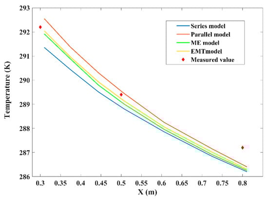 By using different effective thermal conductivity models, four groups of thermal conductivity were calculated and were adopted in the numerical cases. We made an auxiliary line from point C to point E and derive all the temperature values along the auxiliary line in the four groups of cases. The variation curves of temperature from point C to E with different wax layer thermal conductivity are shown in Figure 6. It can be seen that the calculated temperature values show a trend of gradual decrease, with minor deviations of the four models. The absolute deviation of the calculated values at each position from point C to E is less than 1 K. The temperature distributions of the curves using the ME method and EMT method are the closest to the measured value, indicating that the ME method and the EMT method are more suitable for estimating the effective thermal conductivity of waxy layer. Although the two models have similar computational accuracy, the EMT model is better because it has no restrictions on the continuous phase and dispersed phase, and the assumption of the EMT model is more suitable for the wax layer with flaky or needle-like structure. Therefore, the EMT model was used to calculate the effective thermal conductivity of the wax layer in the subsequent simulation cases.