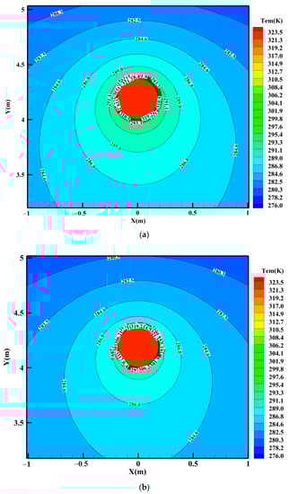 As can be seen from Figure 7, in the cross section, the contour varied greatly in the case of the model with a wax layer or not. According to the isotherms of the two cases that the area of the isotherm envelope was reduced in the case with 4 mm wax layer. Specifically, the lowest position of the 286.8 K isotherm was about 3.4 m when the 4 mm wax layer is taken into account, and was about 3.6 m without the wax layer. Similarly, compared with Figure 7a, the distribution range of 284.6 K isotherm in Figure 7b also reduced significantly. The intersection points between 284.6 K isotherm and the right half of the X-axis decreased from 0.7 m to 0.3 m. The results above proved that the influence of the wax layer on the heat transfer is not to be ignored. Due to a greater thermal resistance when the wax layer is formed on the inner wall of the pipe, the heat transfer from the oil to the soil is reduced. Therefore, to obtain an accurate temperature field, it is more reasonable to consider the wax layer in the thermal calculation of crude oil pipeline system.