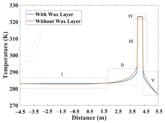 We further discuss the quantitative influence of wax layer on soil temperature field. Figure 8 shows the temperature distribution along the centerline (auxiliary Path 1) on the pipeline cross section which considers the wax layer with 0 mm and 4 mm thickness. The range of the x-axis is (−4.5 m, 5.5 m) since the data points were along the path from the lower boundary to the upper boundary of the model. The temperature curve along the centerline was divided into five parts for discussion. In part I, the temperature remains unchanged from the lower boundary of the soil to the position of ordinate about 1 m, indicating that the heated pipeline has no obvious thermal influence on the soil in this part. In part II, the soil temperature increased gradually, indicating that the temperature of the soil is positively correlated with the distance between soil and pipe within the range of thermal influence. In part III, the temperature rose sharply due to a large temperature gradient caused by the high thermal resistance of the insulating layer. In part IV, the temperature reached the maximum value and remained constant, which corresponds to the temperature of the oil flow in the pipeline. In part V, temperature decreases gradually, indicating that the soil temperature is closer to the ambient temperature as it gets closer to the ground surface.