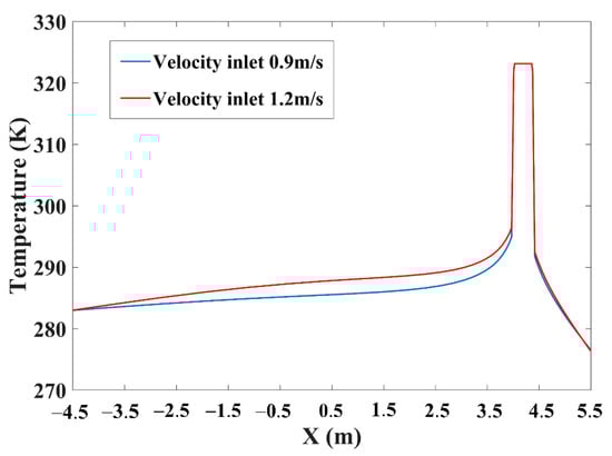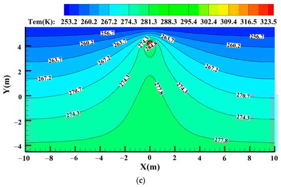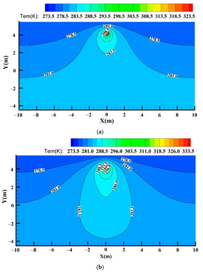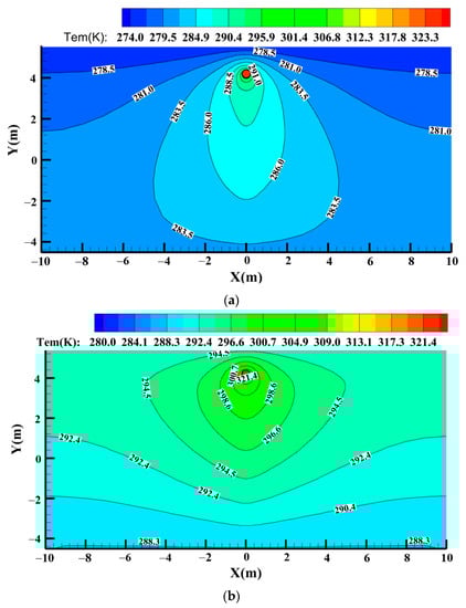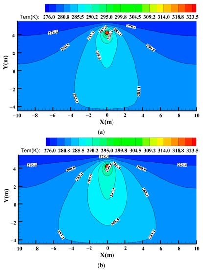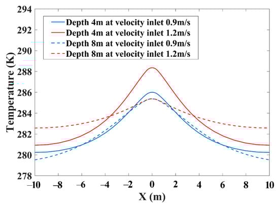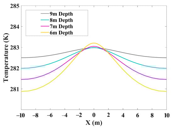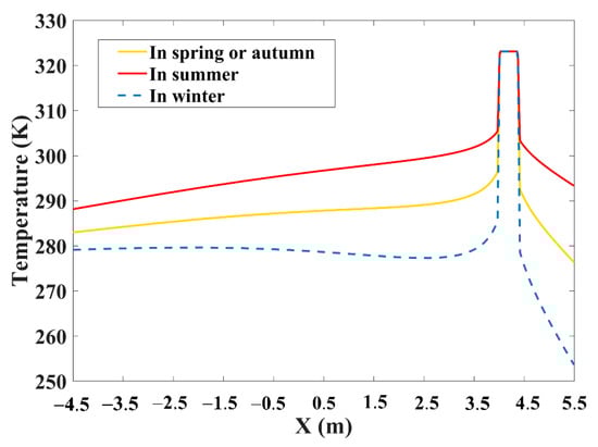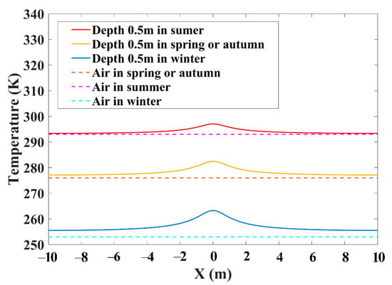 Figure 17 shows soil temperature distribution at a depth of 0.5 m in different seasons. In the main part of the curves, the values are close to air temperature and only rise in the range of −2 m to 2 m along the X-axis. It indicates that the temperature at the depth of 0.5 m is mainly determined by the environment. With the help of the temperature curve, we can estimate the soil temperature near the pipeline. For instance, in summer, the soil temperature at 0.5 m depth which is directly above the pipe exceeds the air temperature by about 3 K.