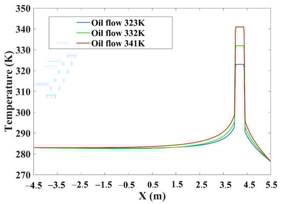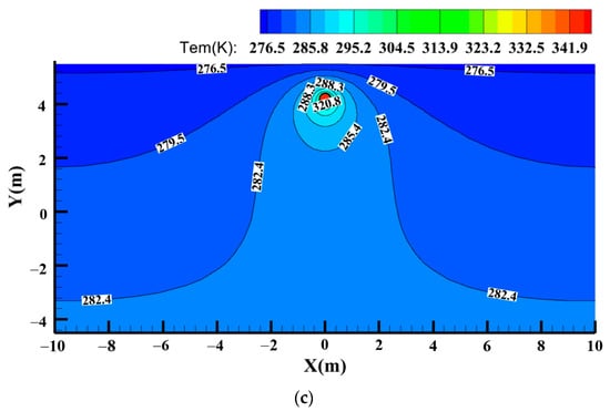 The heated crude oil dissipates heat during pipeline transportation, and the oil flow acts as the heat source and affect the formation of temperature field. The influence of oil flow on heat transfer of buried pipeline system was studied quantitatively by controlling the state of oil flow at the inlet. We first conducted a comparative test of oil flow with the same flow rate but different temperatures. In the three simulation cases adopted, the oil flow temperature at inlet was set at 323 K, 332 K, and 341 K, respectively. The Reynolds numbers were 21,151, 26,952, and 33,226, respectively. The rest calculation conditions were the same, including oil velocity (0.8 m/s), the convective heat transfer coefficient at the soil surface (25 W/(m·K)), and the soil thermostatic layer (283 K). Figure 9 shows the temperature fields on the cross sections at different oil flow temperatures.