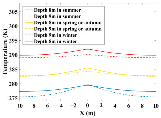 Figure 18 shows soil temperature distribution at a depth of 8 m and 9 m in different seasons. It can be seen from the Figure 18 that in different seasons, although the curves of the two depths have different trend and deviation ways, the maximum deviation of the temperature curves at 8 m depth and 9 m depth is less than 2.5 K. In other words, no matter the external environment changes, the soil temperature distributions at 8 m and 9 m depth are similar.