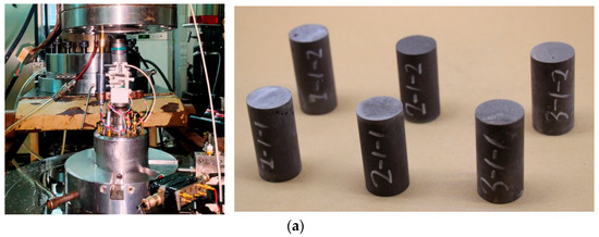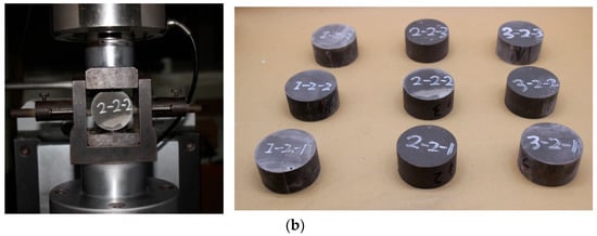 The triaxial pressure tests and Brazilian splitting tests of well cement were conducted to study the mechanical performance of well cement under 150 °C and 15 MPa. Cement specimens were prepared, according to API RP 10B-2 [20], using Class G cement with 44% water By Weight of Cement (BWOC). As a chemical strategy, typical 35% BWOC silica flour was added to avert the strength deterioration of well cement at high temperatures [3,11]. The curing temperature of 80 °C (conventional temperature for wellbore) was used for the control specimen and 150 °C was used for the specimen of interest. Table 1 shows the components, C/S, and curing conditions of the specimens in each test. Cylindrical specimens 25.4 mm in diameter and 38.1 mm in length were prepared for triaxial tests (Figure 1a), and cylindrical specimens 50 mm in diameter and 25 mm in length were used for splitting tests (Figure 1b). For each cement batch, the strength values of two specimens (Figure 1a) were averaged for compressive tests, and three specimens (Figure 1b) were averaged for splitting tests.