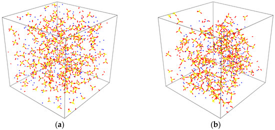 These particles are equilibrated at T = 300 K (27 °C) using MD simulations in the canonical (NVT) ensemble, then relaxed at T = 300 K and P = 15 MPa in the NPT ensemble. Since the energy barrier associated with the breakage of Si-O-H and the formation of Si-O-Si is high, following Refs. [19,24], the polymerization simulations are carried out at an elevated temperature in the NVT ensemble to accelerate the reaction, thus reducing the time cost, i.e., 1000 K, 1500 K, and 2000 K are used for evaluating the effects of temperature on the hydration process [19,22]. The interactive interactions were described by a reactive potential adopted from Ref. [25]. The potential has been successfully adopted in describing the chemical reactions of silicate materials [26,27,28], including the formation and breakage of bonds and charge transfers among atoms. The atom structure after the reaction in the box is shown in Figure 2b.