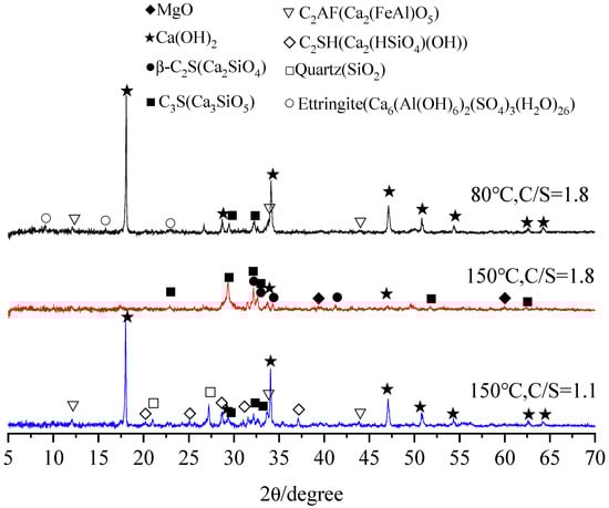 The results of the XRD tests are shown in Figure 4. At 80 °C and 1.8 of C/S, we find C3S (2θ = 29.3°, 32.1°), Ca(OH)2 (2θ = 18.0°, 34.1°, 47.1°, 50.8°, 54.3°, 62.6°, 64.2°), ettringite (2θ = 9.0°, 15.8°, 22.9°, 37.1°), and C2AF (2θ = 12.1°33.6°, 43.8°).