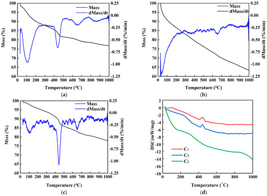 TG/DTG/DSC patterns of cement under different C/S and curing conditions. (a) TG/DTG tests for C1 (80 °C, C/S = 1.8); (b) TG/DTG tests for C2 (150 °C, C/S = 1.8); (c) TG/DTG tests for C3(150 °C, C/S = 1.1); (d) DSC tests.