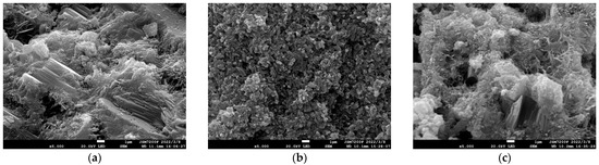 SEM micrographs of cement under different C/S and curing conditions. (a) 80 °C, 15 MPa; C/S = 1.8; (b) 150 °C, 15 MPa; C/S = 1.8; (c) 150 °C, 15 MPa; C/S = 1.1.